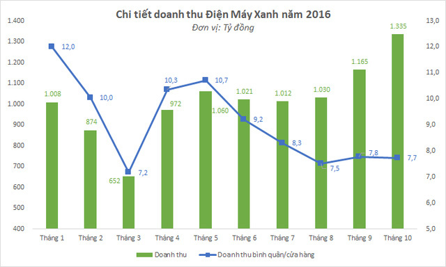 Tháng 1 năm 2016, hệ thống Điện Máy Xanh với 84 cửa hàng đem về doanh thu 1.008 tỷ đồng. Nhưng đến các tháng 5-6-7-8, doanh thu vẫn dậm chân tại chỗ, chỉ loanh quanh trên 1.000 tỷ đồng, cho dù số cửa hàng cuối tháng 8 đã lên tới 137.